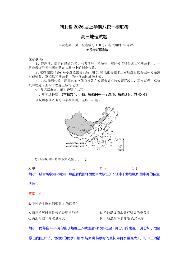 高三地理(精品解析版)--湖北省八校2026届高三上学期一模考试