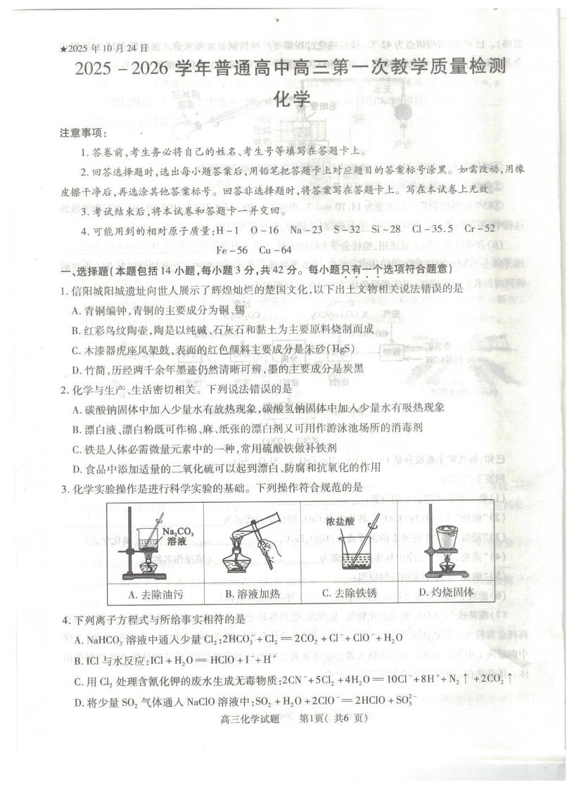 高三化学--河南省信阳市2026届高三第一次教学质量检测地理