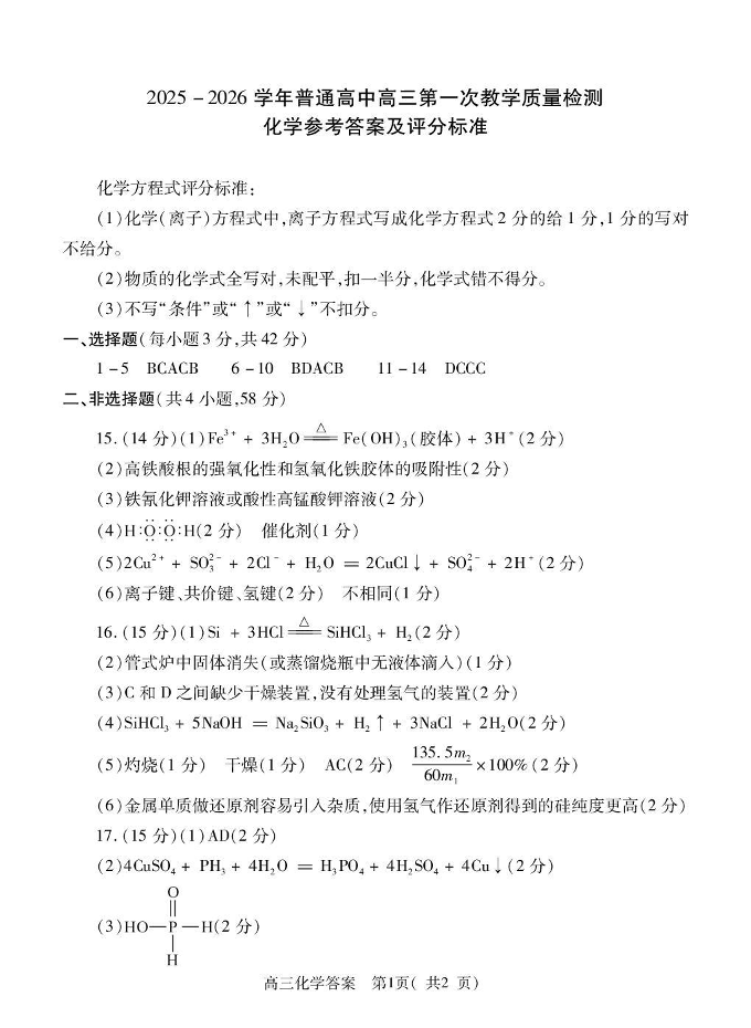 高三化学答案--河南省信阳市2026届高三第一次教学质量检测地理