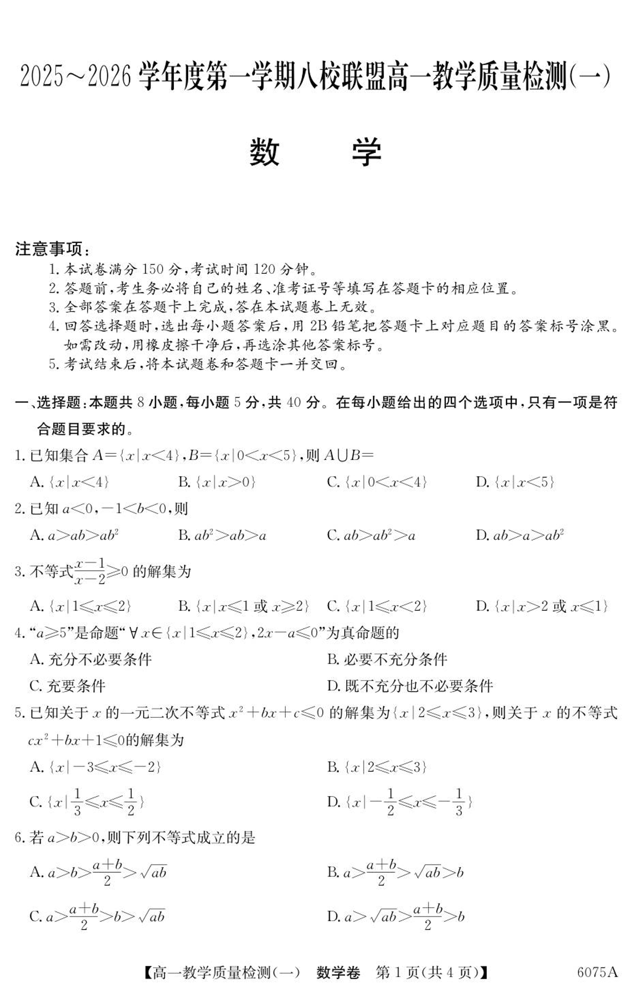 高一数学--广东省八校联盟2025-2026学年高一上学期教学质量检测(一)