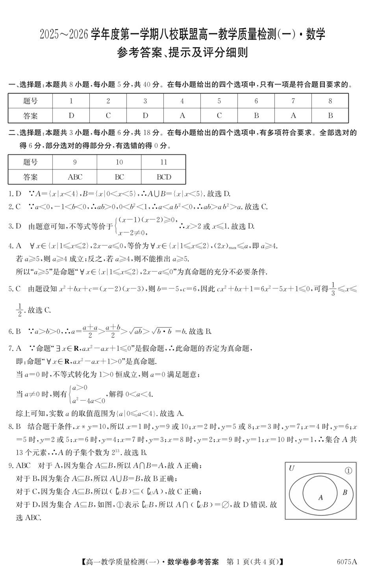 高一数学答案--广东省八校联盟2025-2026学年高一上学期教学质量检测(一)