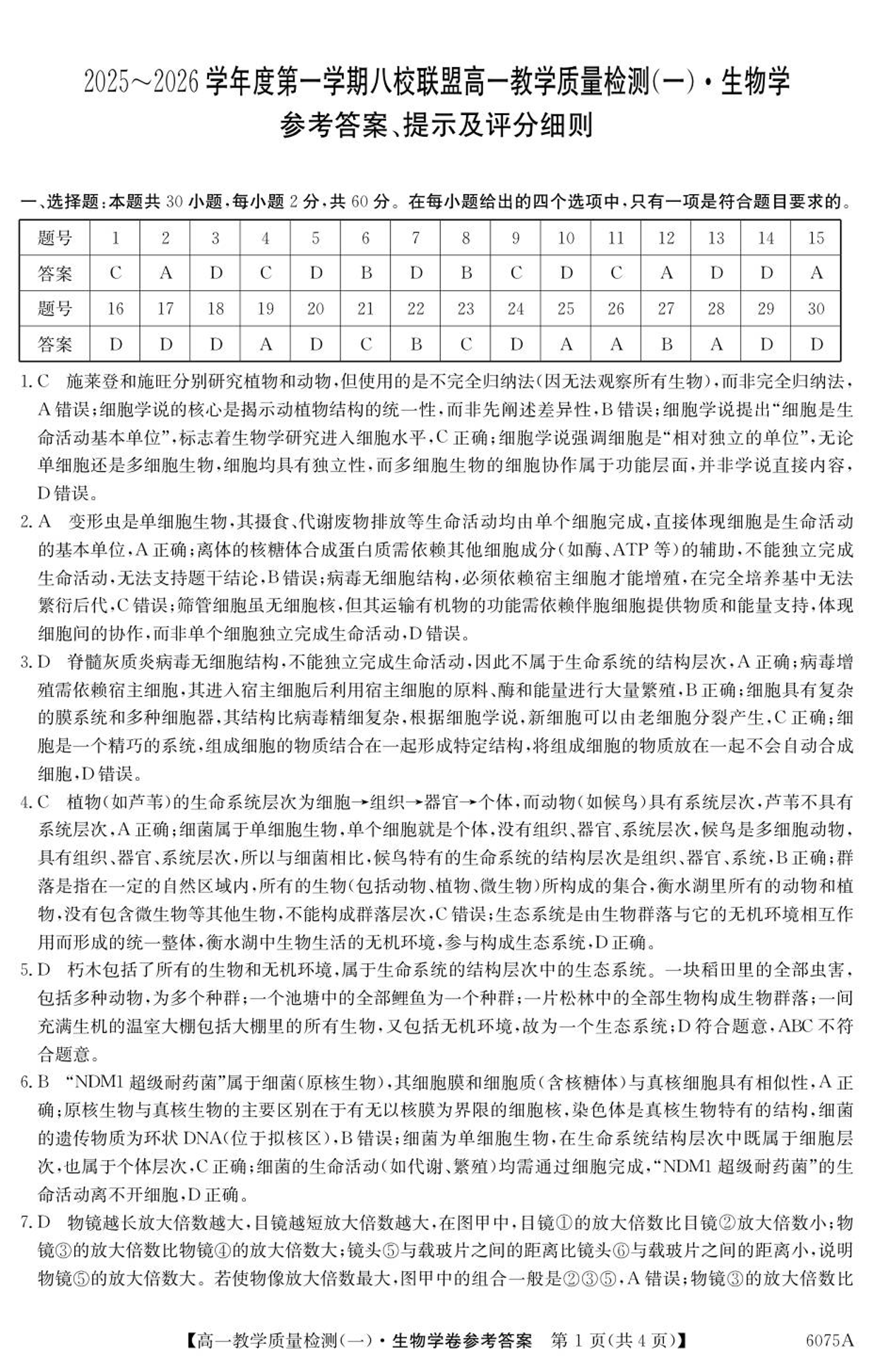 高一生物答案--广东省八校联盟2025-2026学年高一上学期教学质量检测(一)