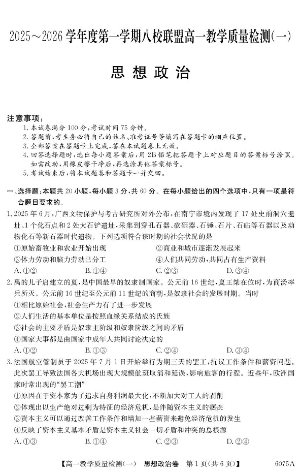 高一政治--广东省八校联盟2025-2026学年高一上学期教学质量检测(一)