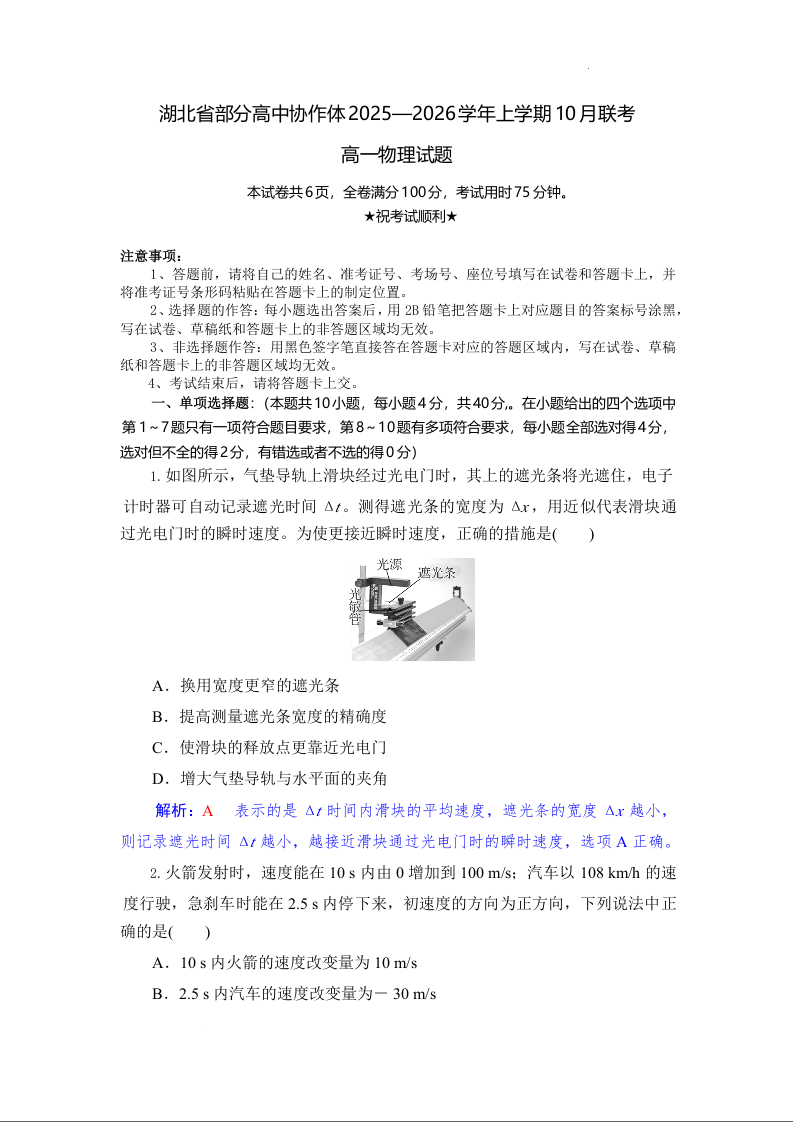 高一物理(精品解析版)--湖北省部分高中协作体2025-2026学年高一上学期10月月考