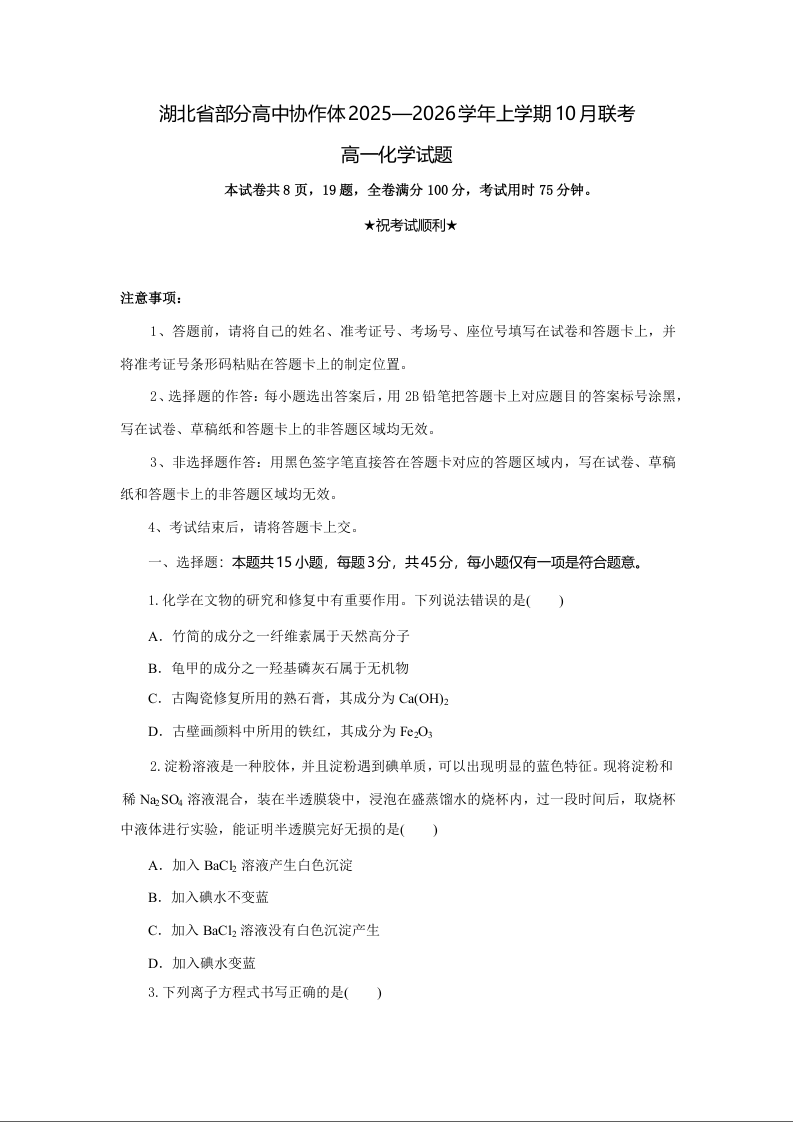 高一化学(原卷版)--湖北省部分高中协作体2025-2026学年高一上学期10月月考