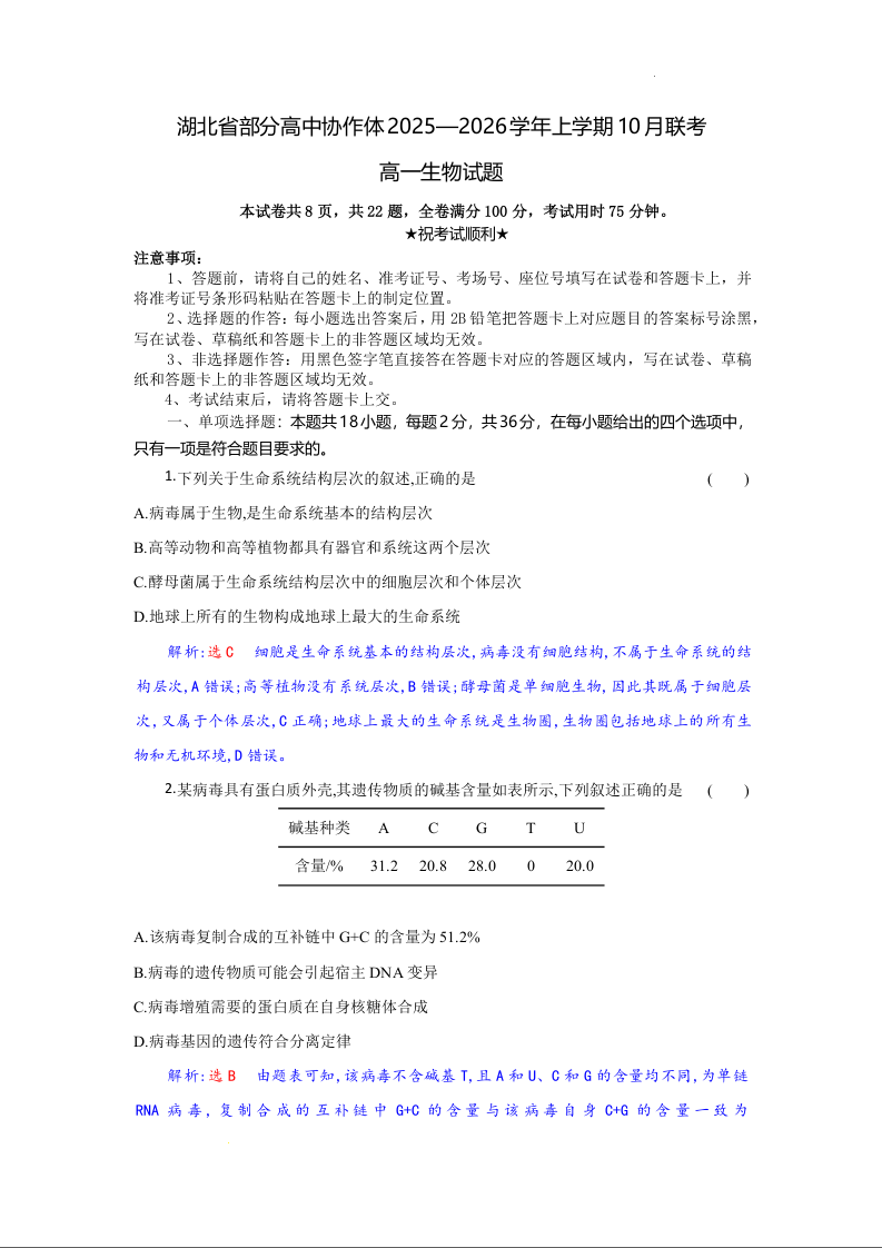 高一生物(精品解析版)--湖北省部分高中协作体2025-2026学年高一上学期10月月考