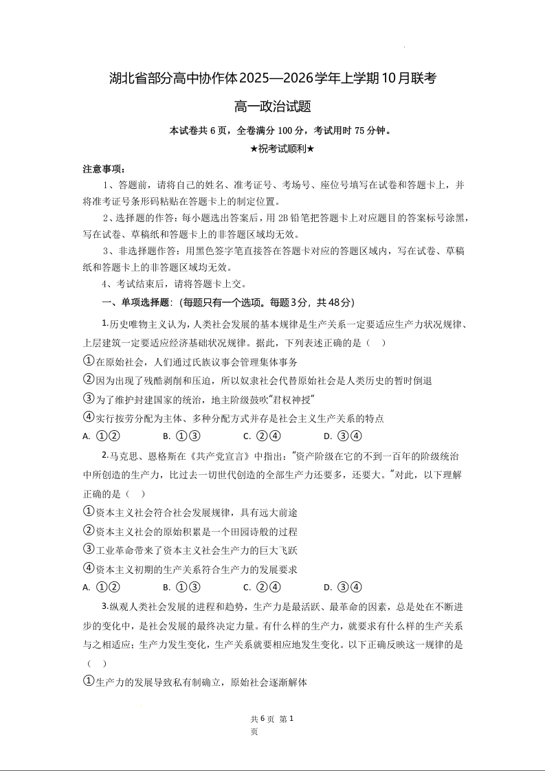 高一政治(原卷版)--湖北省部分高中协作体2025-2026学年高一上学期10月月考