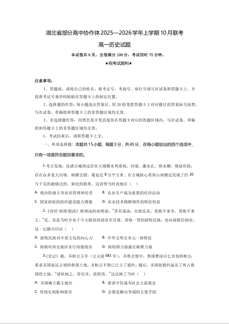 高一历史(原卷版)--湖北省部分高中协作体2025-2026学年高一上学期10月月考