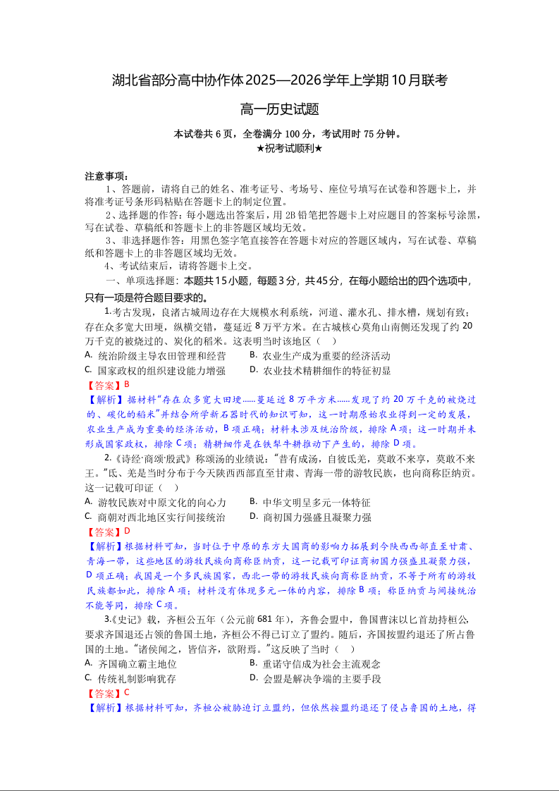 高一历史(精品解析版)--湖北省部分高中协作体2025-2026学年高一上学期10月月考