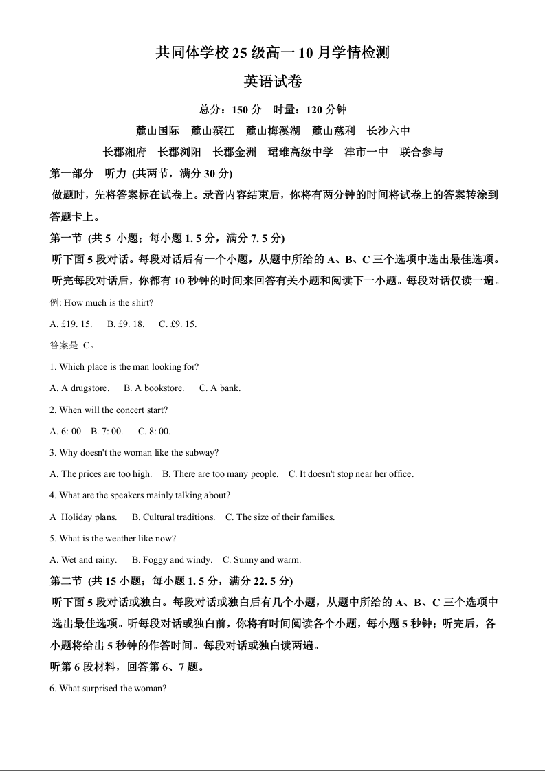 高一英语(原卷版)--湖南省长沙麓山国际实验学校2025-2026学年高一上学期10月月考