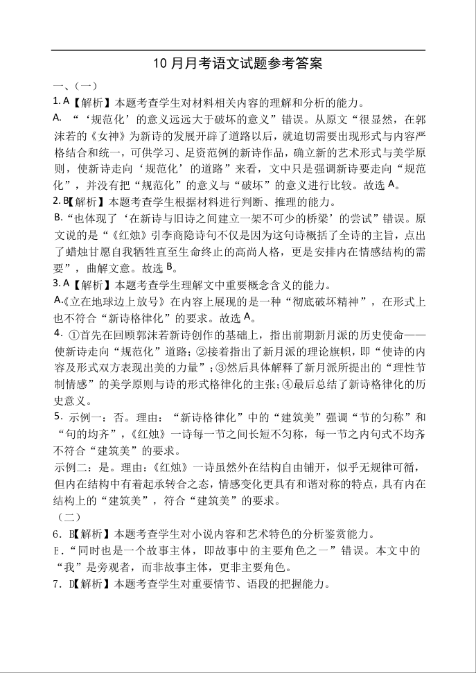 高一语文答案--山东省德州市夏津第一中学2025-2026学年高一上学期10月月考