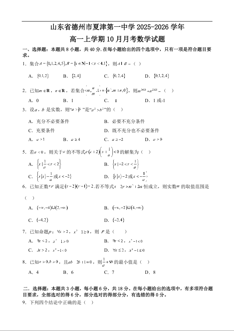 高一数学--山东省德州市夏津第一中学2025-2026学年高一上学期10月月考