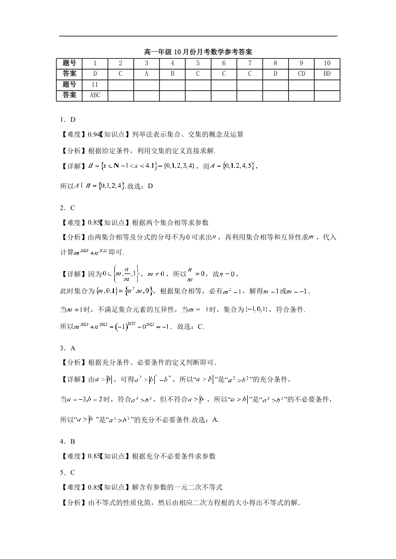 高一数学答案--山东省德州市夏津第一中学2025-2026学年高一上学期10月月考