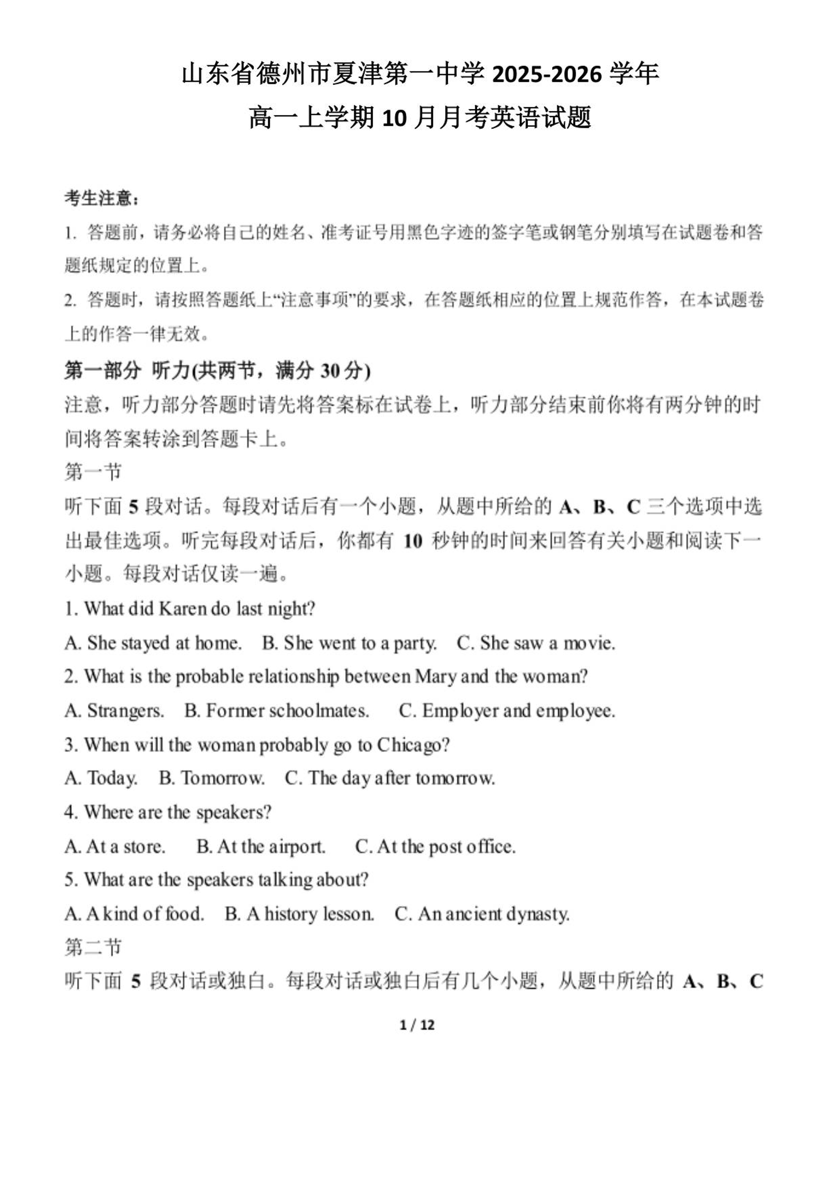 高一英语--山东省德州市夏津第一中学2025-2026学年高一上学期10月月考