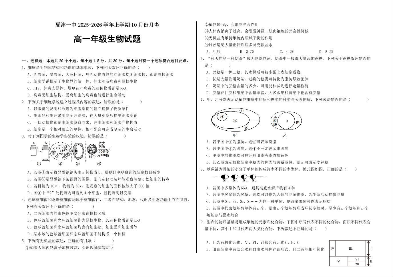 高一生物--山东省德州市夏津第一中学2025-2026学年高一上学期10月月考