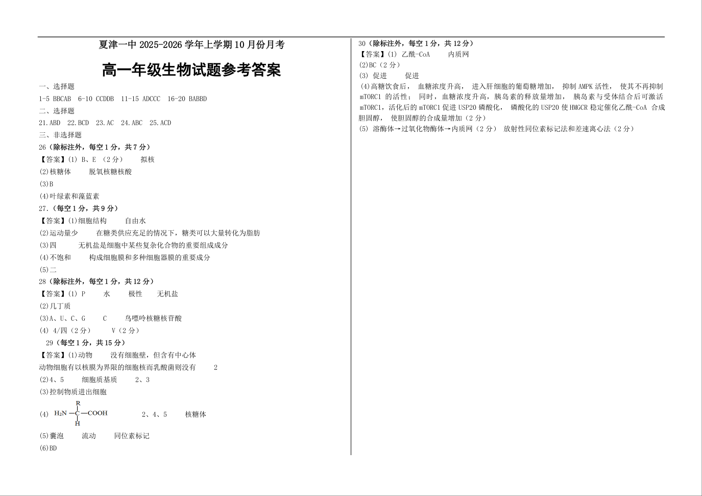 高一生物答案--山东省德州市夏津第一中学2025-2026学年高一上学期10月月考