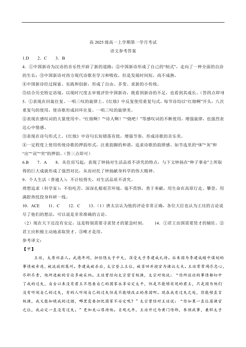 高一语文答案--四川省泸州市泸县第五中学2025-2026学年高一上学期10月月考