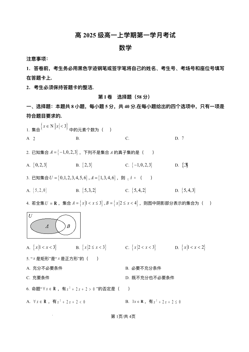 高一数学+答案--四川省泸州市泸县第五中学2025-2026学年高一上学期10月月考