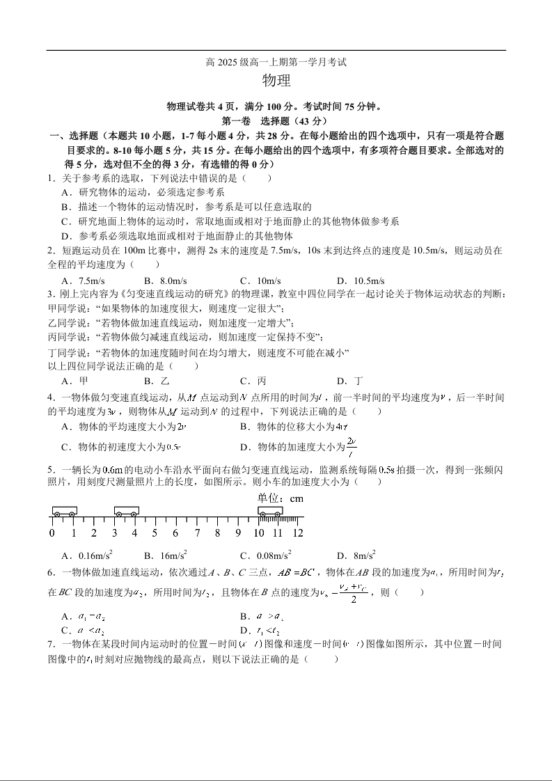 高一物理--四川省泸州市泸县第五中学2025-2026学年高一上学期10月月考