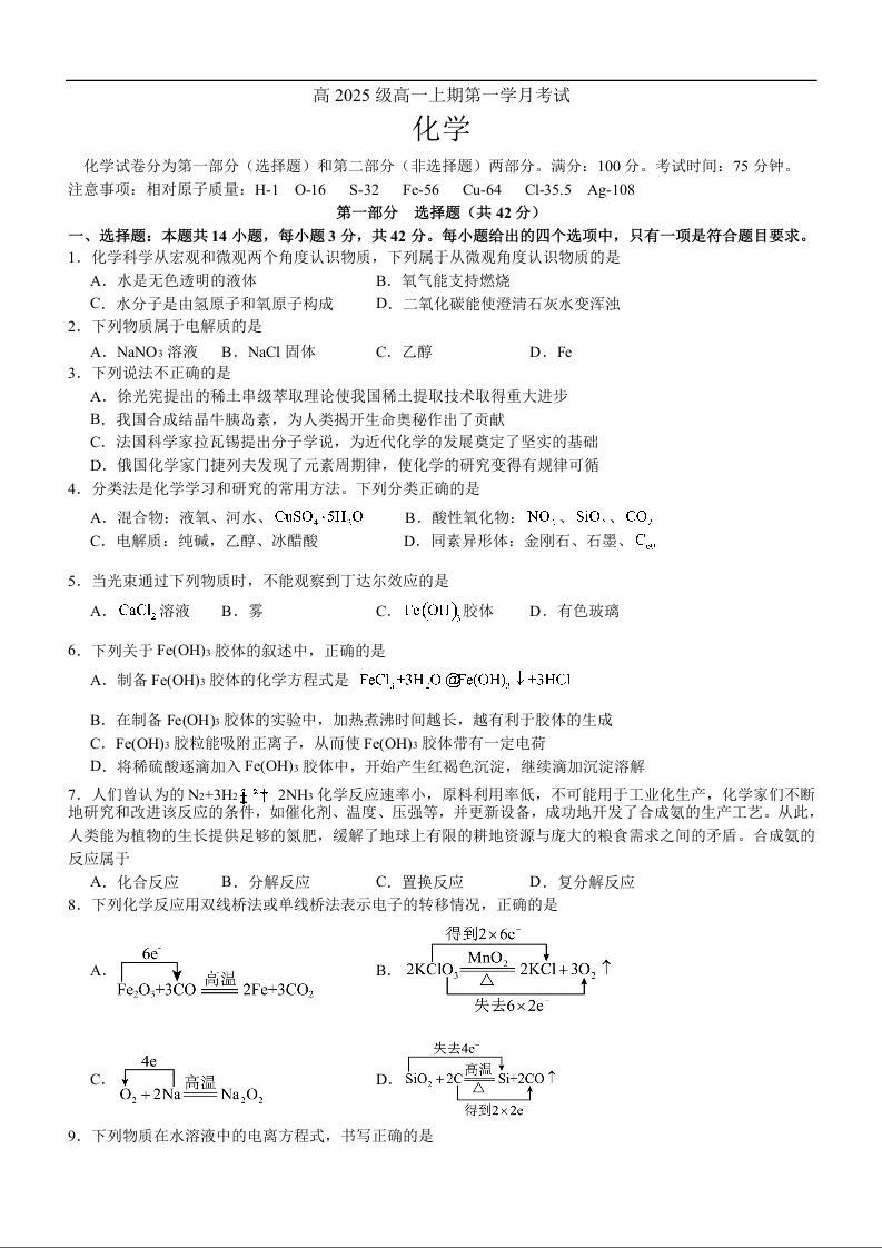 高一化学--四川省泸州市泸县第五中学2025-2026学年高一上学期10月月考