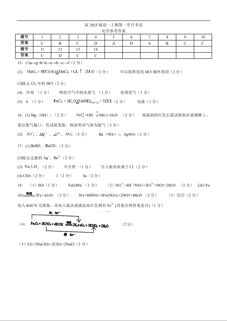 高一化学答案--四川省泸州市泸县第五中学2025-2026学年高一上学期10月月考