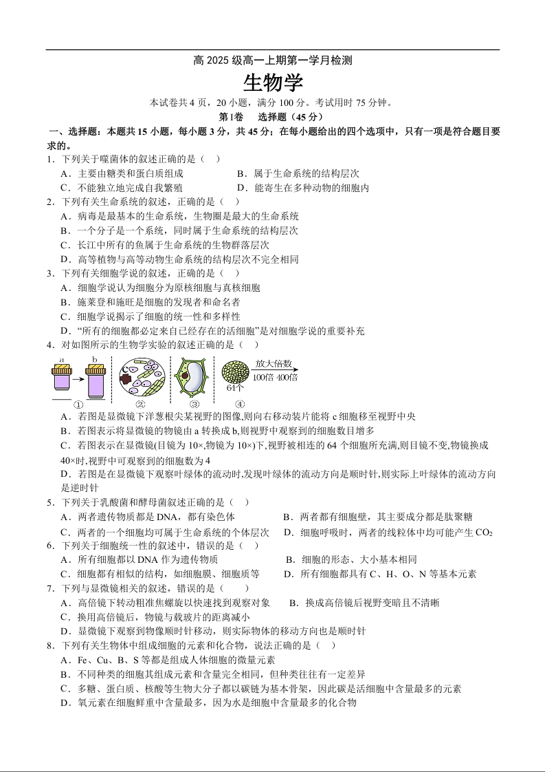 高一生物--四川省泸州市泸县第五中学2025-2026学年高一上学期10月月考