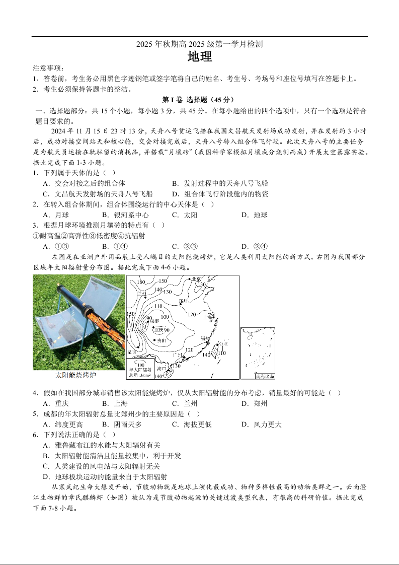 高一地理--四川省泸州市泸县第五中学2025-2026学年高一上学期10月月考