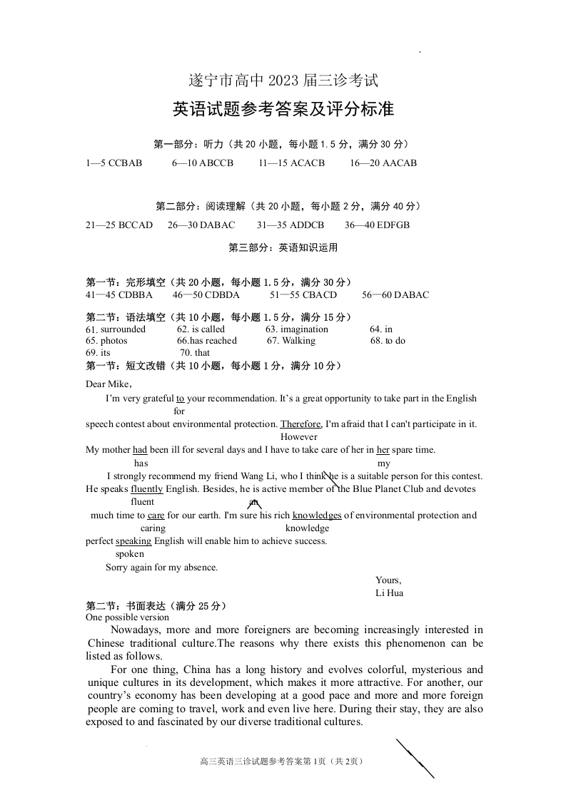 高三英语答案--四川省遂宁市2023届高三下学期三模