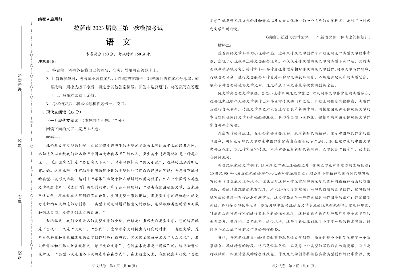 高三语文--西藏拉萨市2023届高三下学期第一次模拟考试(拉萨一模)