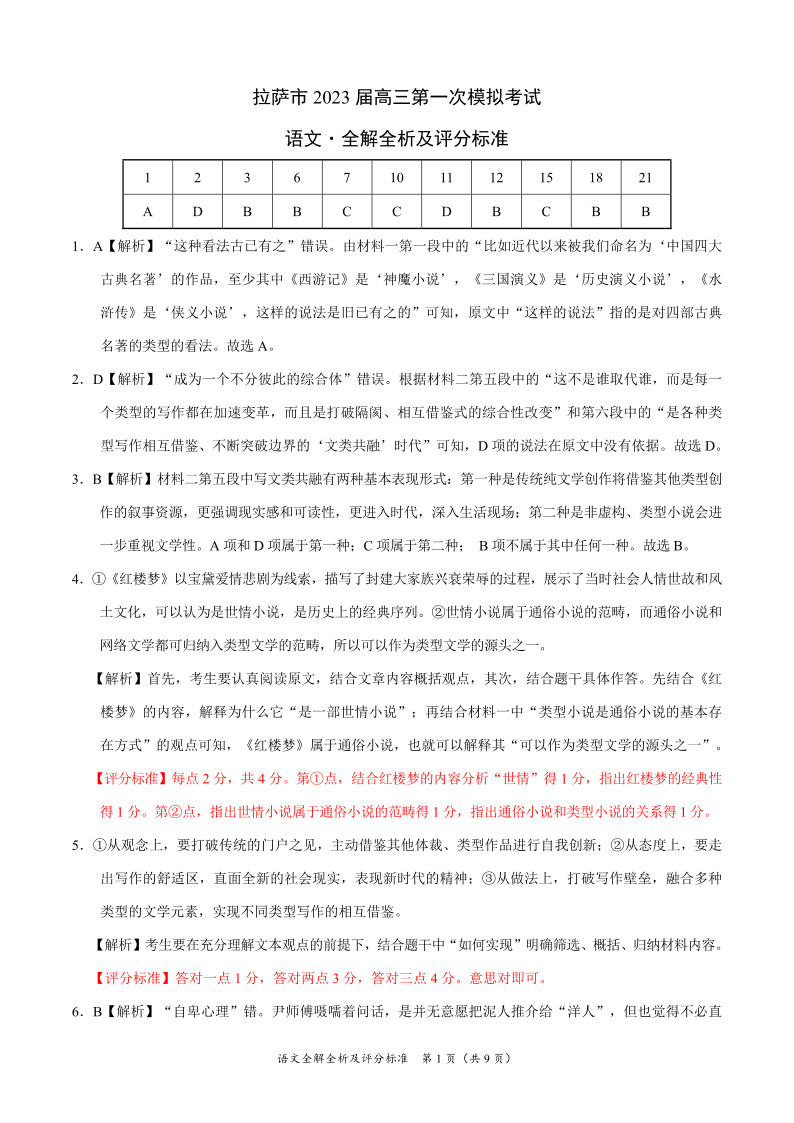 高三语文答案--西藏拉萨市2023届高三下学期第一次模拟考试(拉萨一模)