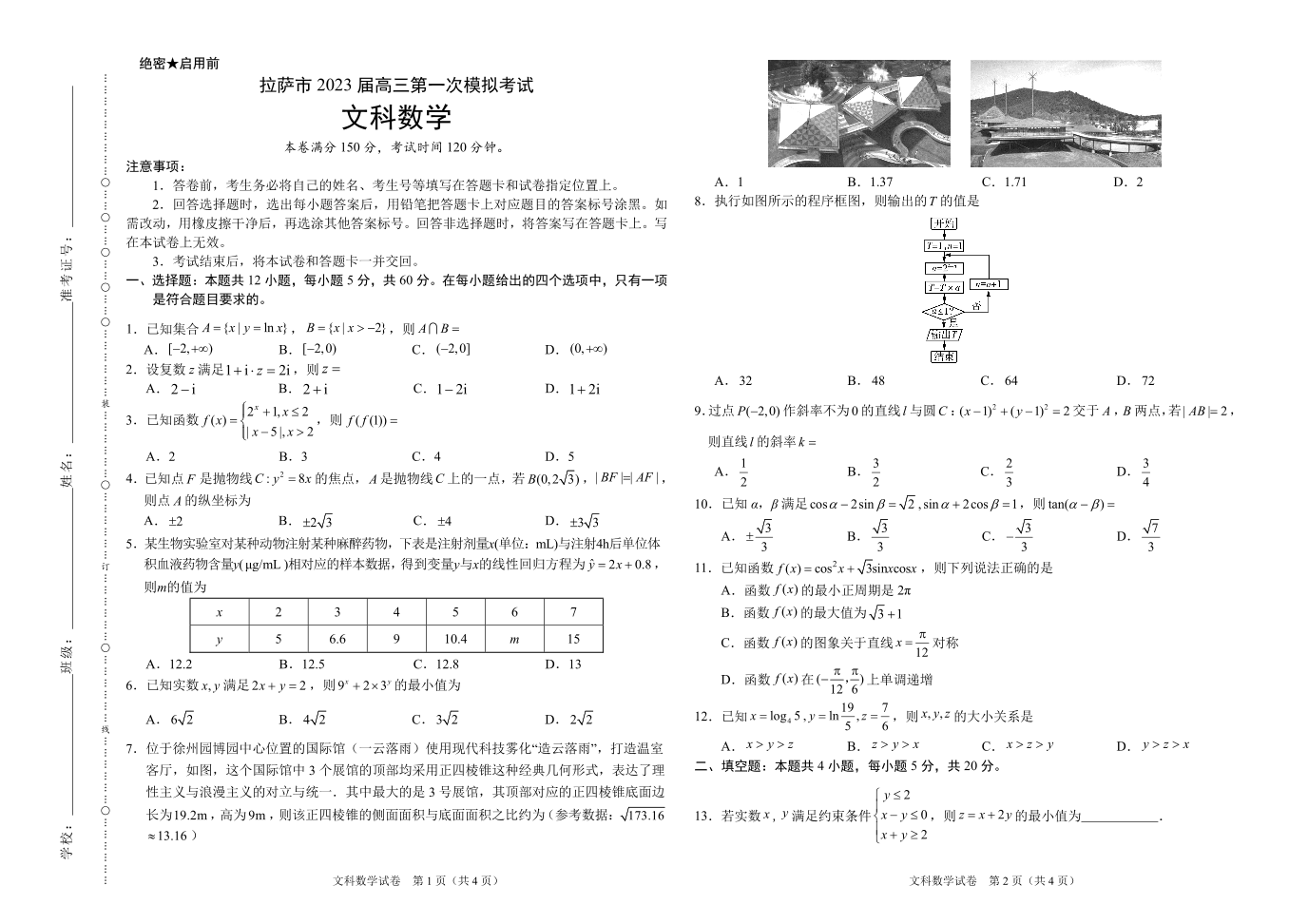 高三文数--西藏拉萨市2023届高三下学期第一次模拟考试(拉萨一模)