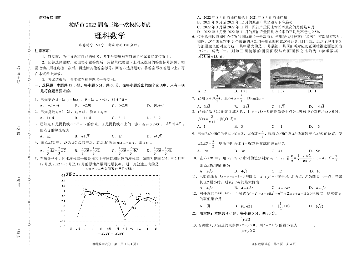 高三理数--西藏拉萨市2023届高三下学期第一次模拟考试(拉萨一模)