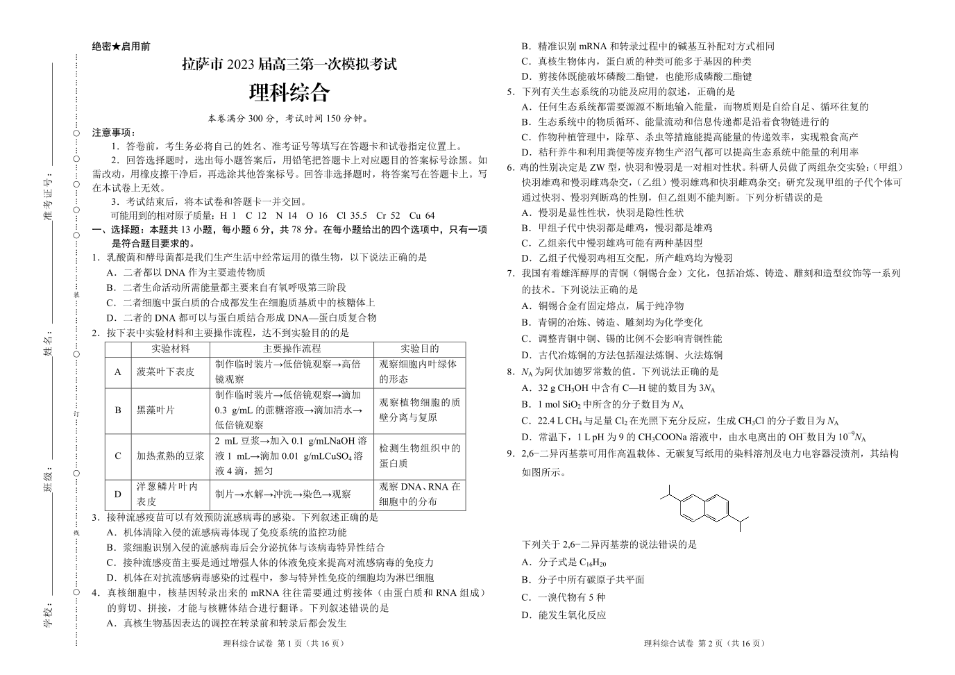 高三理综--西藏拉萨市2023届高三下学期第一次模拟考试(拉萨一模)