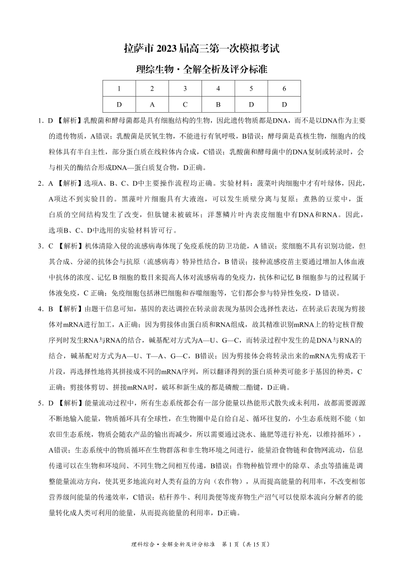 高三理综答案--西藏拉萨市2023届高三下学期第一次模拟考试(拉萨一模)