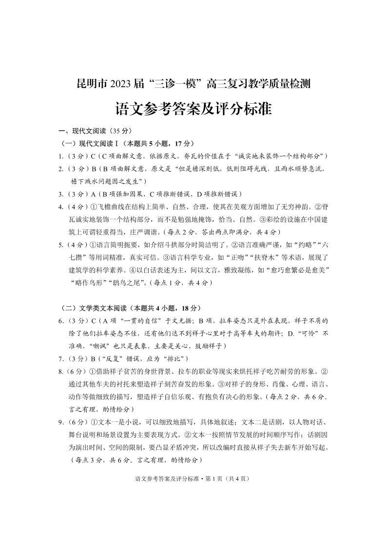 高三语文答案--云南省昆明市2023届高三“三诊一模”