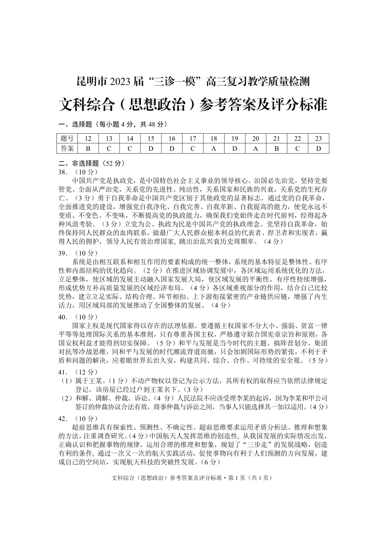 高三文综政治答案--云南省昆明市2023届高三“三诊一模”