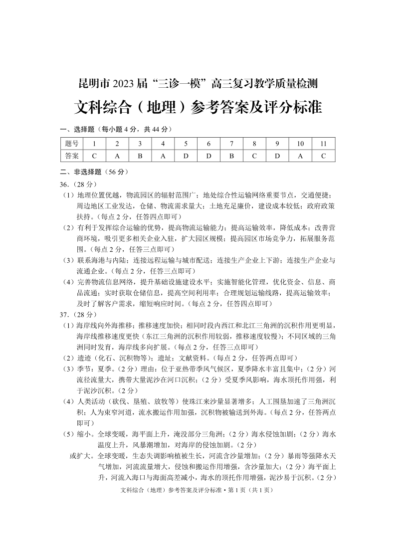 高三文综地理答案--云南省昆明市2023届高三“三诊一模”