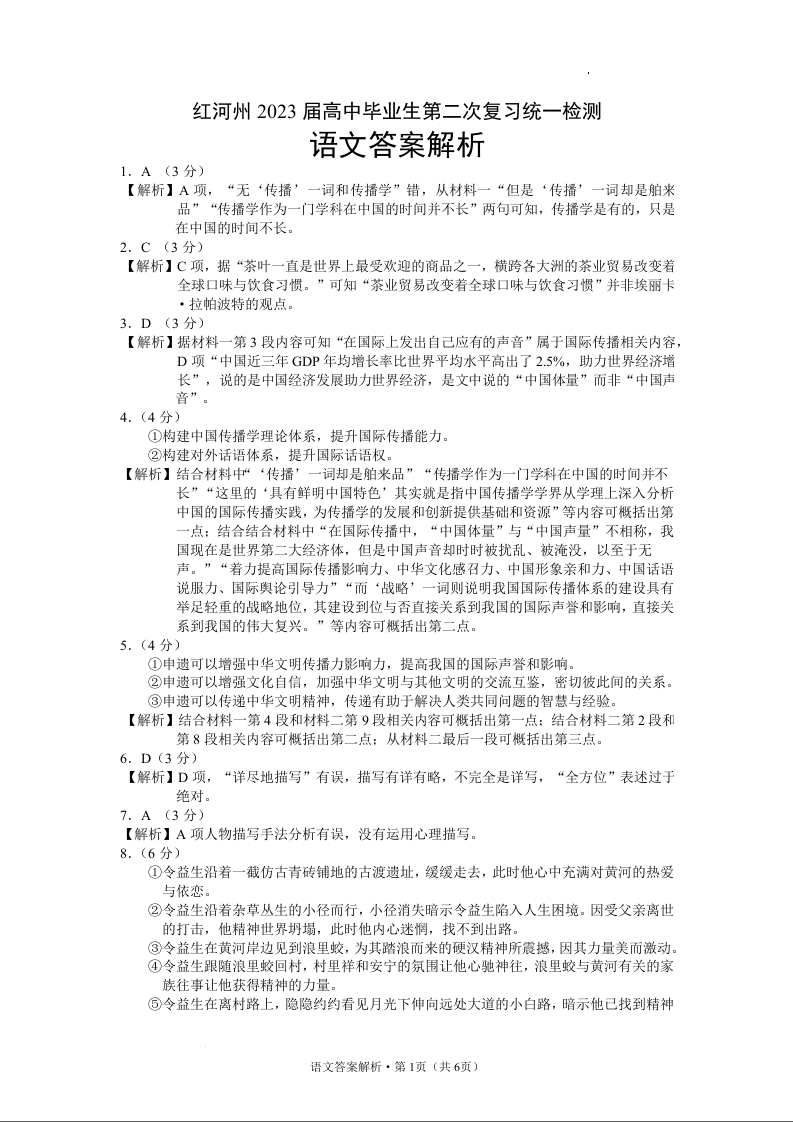 高三语文答案--云南省红河州 2023 届高中生业生第二次复习统一检测