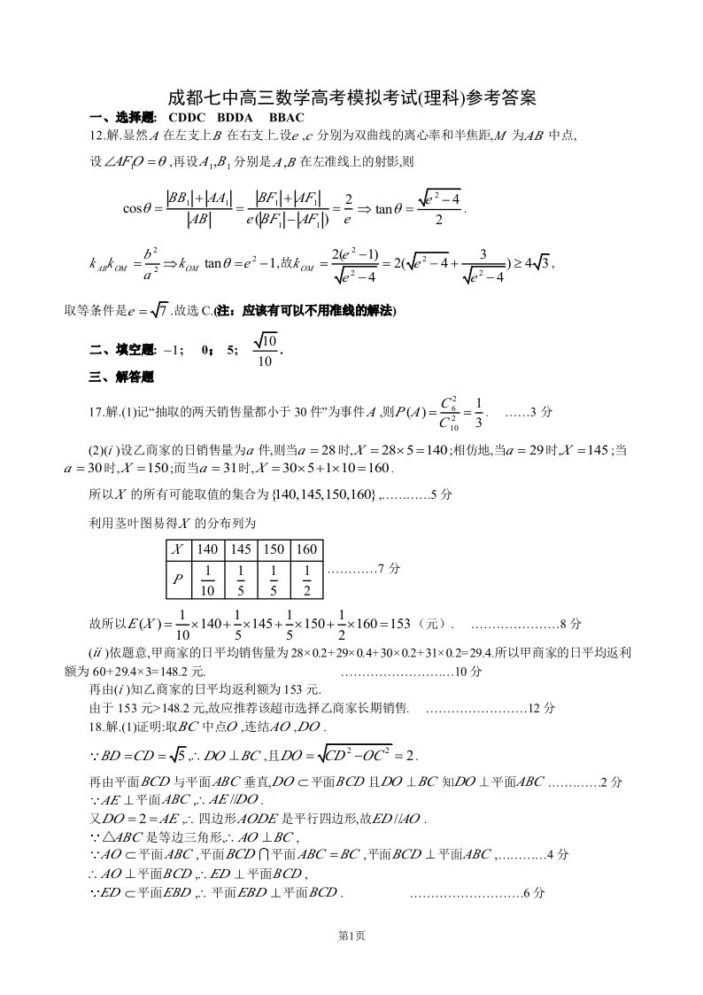 高三理数答案--四川省成都市第七中学2023届高三下学期5月模拟检测