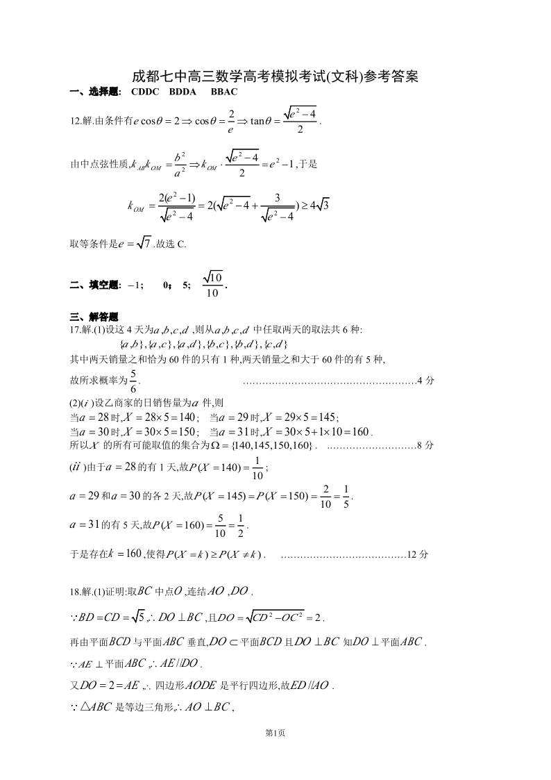 高三文数答案--四川省成都市第七中学2023届高三下学期5月模拟检测