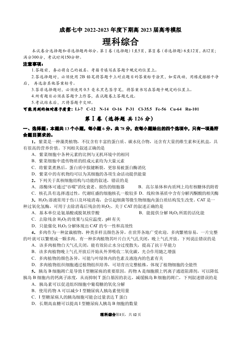 高三理综--四川省成都市第七中学2023届高三下学期5月模拟检测