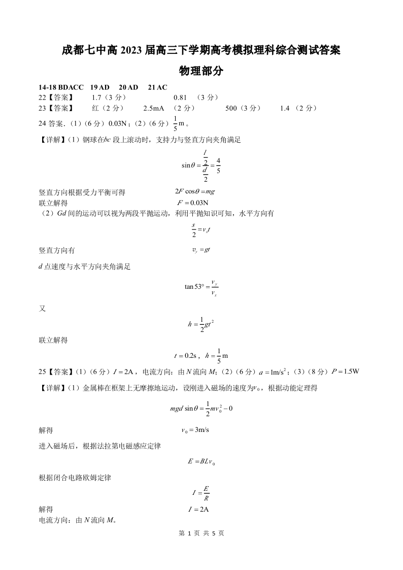 高三理综答案--四川省成都市第七中学2023届高三下学期5月模拟检测
