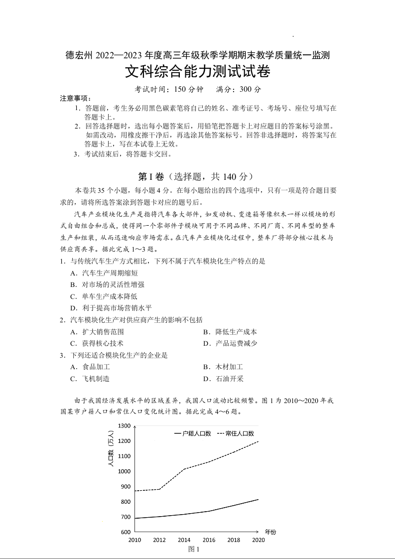 高三文综+答案--云南省德宏州2023届高三上学期期末教学质量统一监测