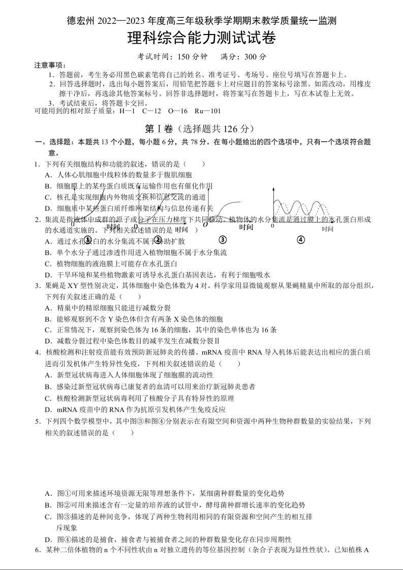 高三理综+答案--云南省德宏州2023届高三上学期期末教学质量统一监测