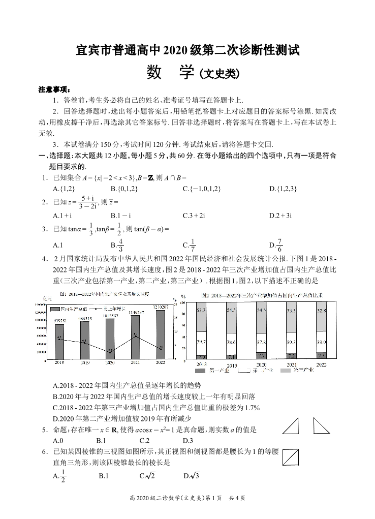 高三文数--四川省宜宾市2023届高三下学期(二诊)