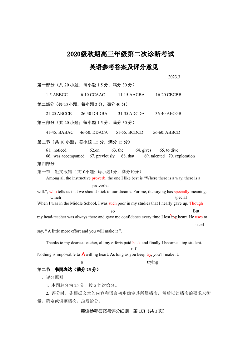 高三英语答案--四川省宜宾市2023届高三下学期(二诊)