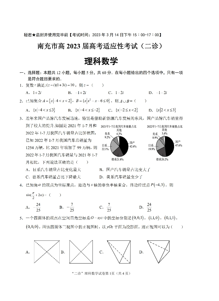 高三理数--四川省南充市2023届高三下学期高考适应性考试(南充二诊)