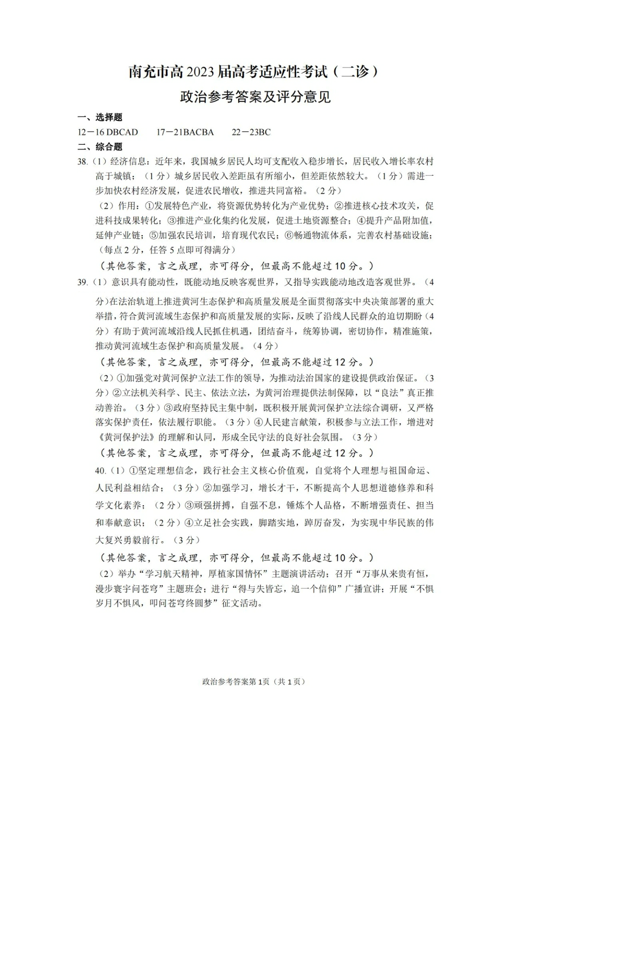 高三文综答案--四川省南充市2023届高三下学期高考适应性考试(南充二诊)