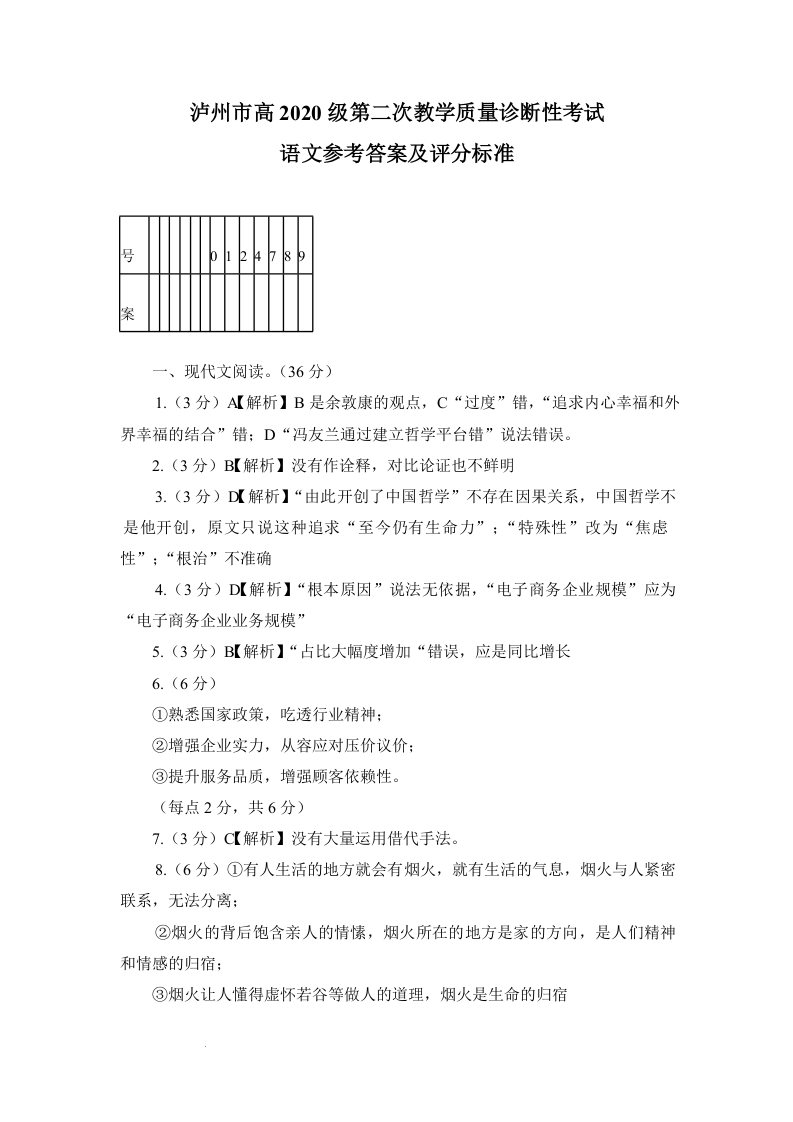 高三语文答案--四川省泸州市2023届高三第二次教学质量诊断性考