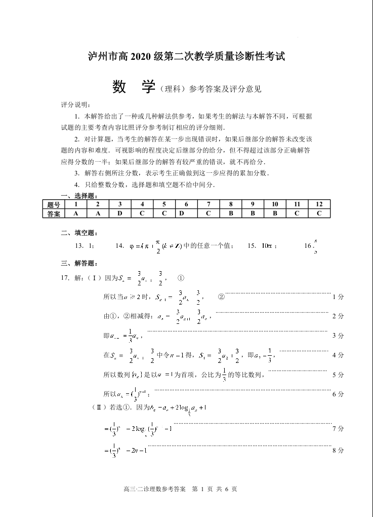 高三理数答案--四川省泸州市2023届高三第二次教学质量诊断性考